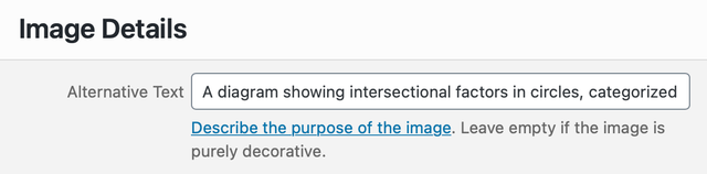 - Describe what you want the image's takeaway. It doesn't have to be literal and shouldn't be too wordy. Most importantly, describe what the image conveys within the context of the content. If the image doesn't add to what you're trying to communicate in the content, the image is decorative and should not have an alt tag.